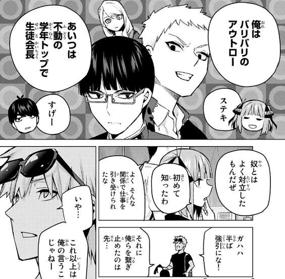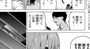 風太郎は自分の父親と五つ子たちの父親が知り合いだったことに驚きますが、二人は学生の時からの腐れ縁で、勇也はバリバリのアウトロー、マルオは不動の学年トップで生徒会長だったそうです。二乃が勇也を絶賛して、素敵と言っています。さらに二人を繋ぎ止めていた先生?もいたようで、会話の流れから五つ子たちの母親の事のようです。