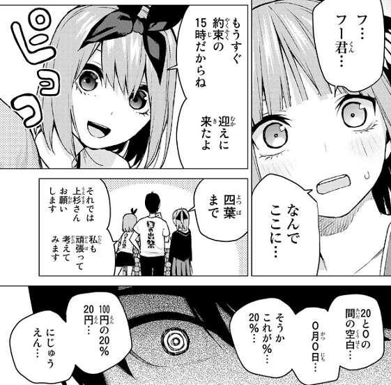 一人っきりになった二乃はこれからどうしようかと思っていると、風太郎と四葉がもうすぐ約束の15時だからと迎えに来ます。いきなり風太郎が現れて嬉しそうに赤面する二乃です。風太郎は折角なので脱出ゲームの問題文に挑戦し始めて、あっさりと答えは「二重円」と解きますが、横では四葉が答えを聞いても未だに分かっていません。