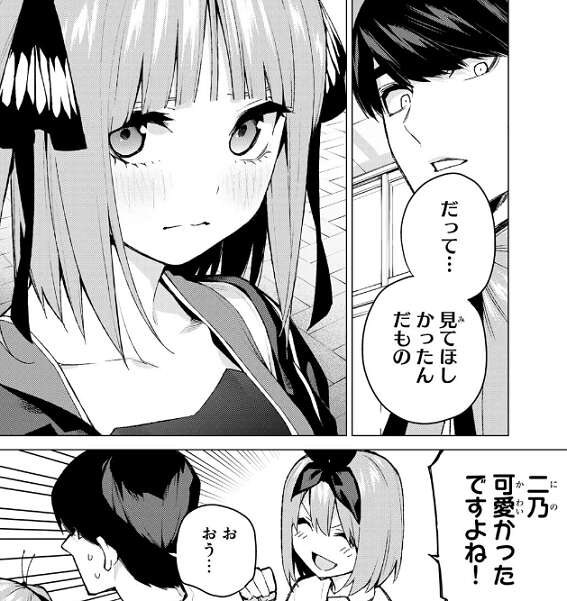 風太郎からいつまでそんな目立つカッコしているんだよと言われますが、二乃は見てほしかったんだもの、と素直に風太郎に言います。そして空気を読まず横から、二乃が可愛かったことを強調する四葉です。どうやらあのオープニングセレモニーは、本当は四葉がやる予定だったようですが、演劇部の仕事も引き受けていた四葉には無理だと思った二乃が引き受けたようです。それにオープニングセレモニーを二乃が引き受けた理由はもう一つ、舞台の上からなら客席が見渡せて、招待状を送った父親が来ていたら見れると思っていたようです。しかし、結局父親の影も形もなかったようですが。