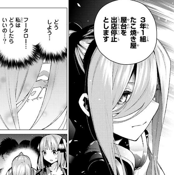 結局、3年1組のたこ焼き屋は屋台を出店停止処分となり、男子と女子を仲直りさせる事も再び難しくなってしまいます。ボヤ発生というトラブルに、どうしていいか分からない三玖は、心の中でフータローに問いかけますが、直後三玖は顔を伏せてしまい二乃が大丈夫か声をかけています。