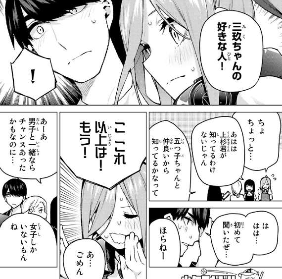 次回、いつまでも意地になっている男子たちと女子たちを仲直りさせるため、三玖は男女の代表を屋上に呼び出します。