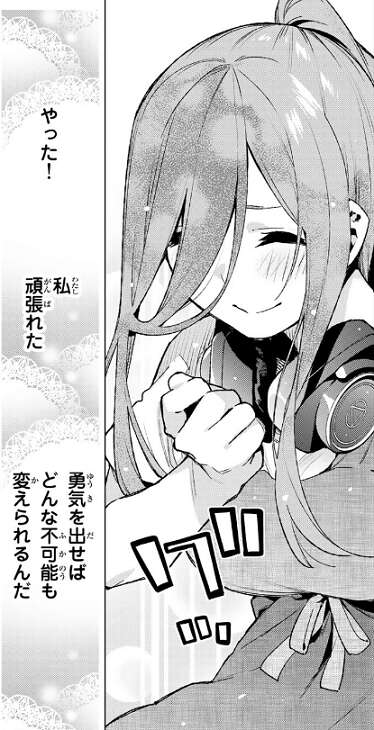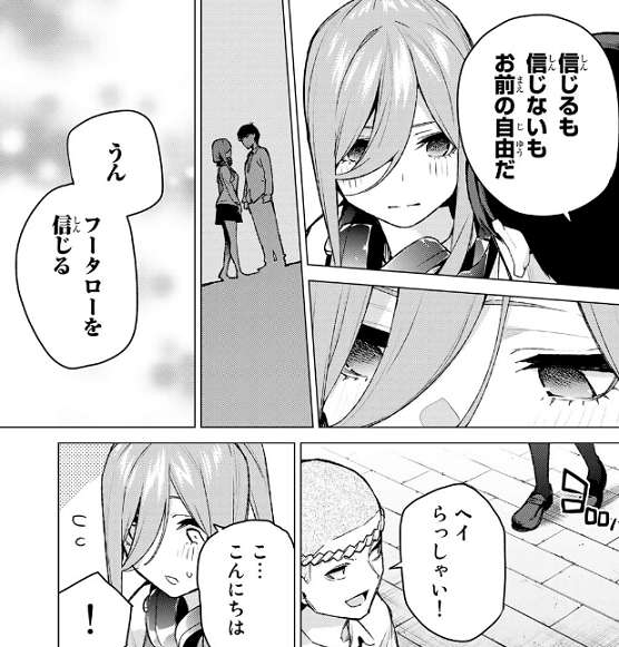 この後風太郎とは一旦分かれて、15時に教室で風太郎と五つ子たちが集まって、風太郎の突然の告白となるようです。風太郎から強くなったと言われ、勇気を出せばどんな不可能も変えられるんだ、と三玖は自分が頑張れたことを素直に喜びます。