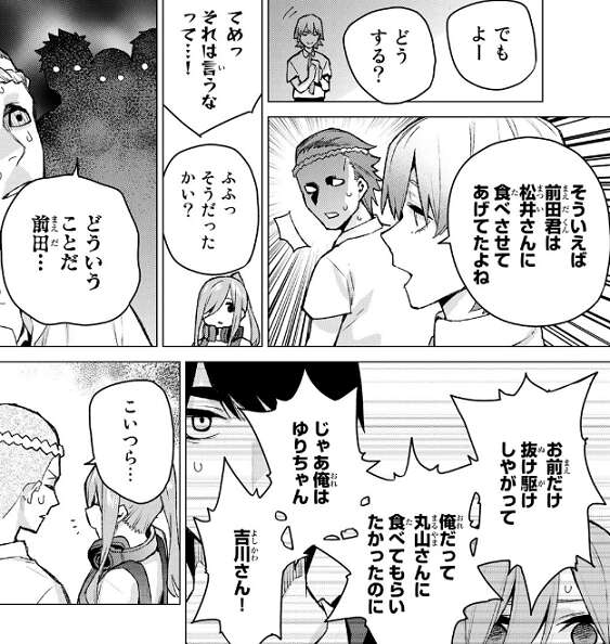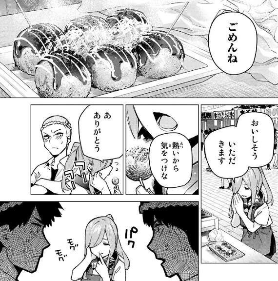いつの間にか男子からパンケーキのリーダーと認識されていた三玖は、最初は文句を言われますが勇気を出してたこ焼きを一つ購入します。たこ焼きを食べて、素直においしいと感想を言うと、前田からおいしさの秘訣を一から説明してもらえます。