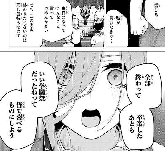 たこ焼きをクラスの女の子たちにも食べさせてあげたいな、と三玖は言い一日目が終わったら皆を連れてくると言います。男子からはそんなこと急に言われてもなぁ…、と渋られますが、三玖から全部終わって卒業したあとも言い学園祭だったねってみんなに喜べるものにしようと後押しされます。