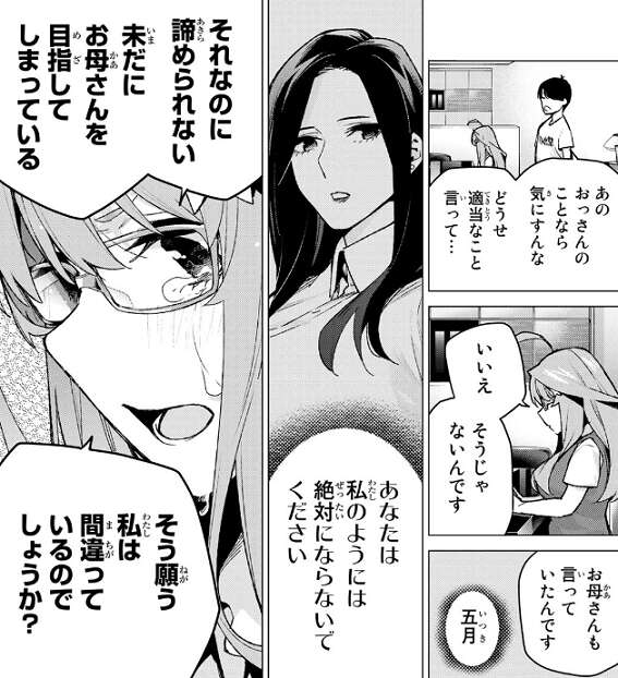 五つ子たちの部屋にたどり着くと、五月はリビングで一人勉強をしています。五月は風太郎に、あなたは私のように絶対にならないでくださいと以前母親から言われたことを伝えます。そして五月は、それでも諦められず母親を目指してしまっている自分は間違っているのでしょうか?と風太郎に質問します。