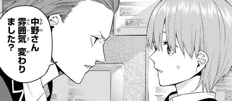 なんと三玖が一花と入れ替わっています(三玖が変装している)。