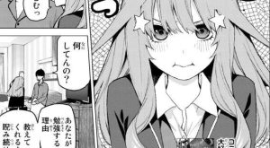 先週、風太郎の小学生時代の思い出と写真の女の子の正体が分かりそうでしたが、結局五つ子達のアホさ故に分からずじまいになってしまいました。「お前らみたいな馬鹿があの子のはずねーわ」と勉強をみっちりふくしゅうしますが、五月?からは「わざと間違えている?」とかまかけられていますね。