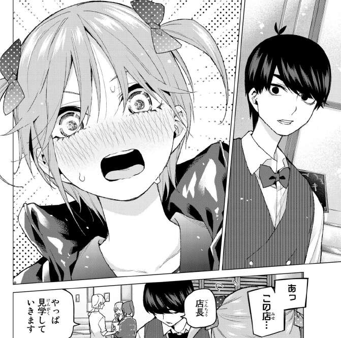 まさか風太郎が務めているアルバイト先とは知らず動揺する一花ですが、風太郎は冷静に対応します。