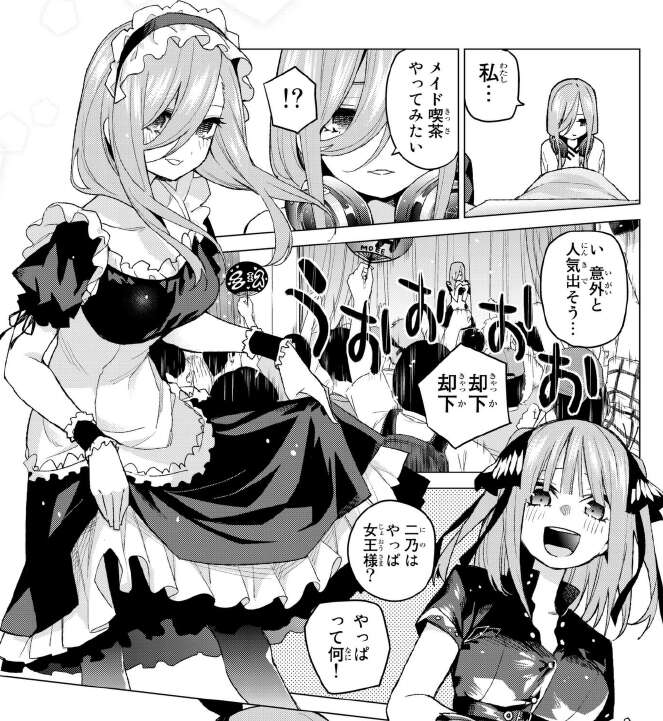 三玖はメイド喫茶をやってみたいと言い、二乃はイメージから女王様を勧められます。三玖のメイドと二乃の女王様です。