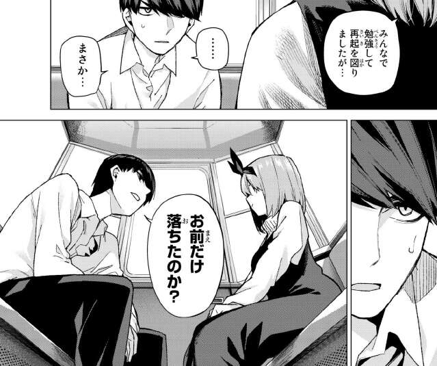 五つ子たちが前にいた高校は名門だったのですが、試験で落第は珍しい話ではなかったようで、追試のチャンスが与えられたのです。が、そこで四葉だけが追試に落ちてしまいました。
