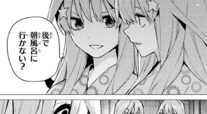が、結局二乃が近づいてきて風太郎は海に落とす事で、二乃を風太郎から隠します。結局二乃は、夜に抜け出して風太郎の所に会いに行くと言い、一花に手伝ってほしいと言います。五つ子のお父さんがネックなので、もし五つ子のお父さんが来そうになったら足止めして欲しいと言います。
