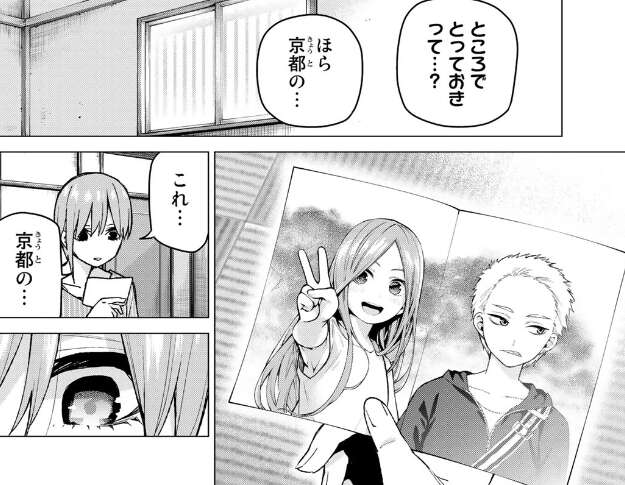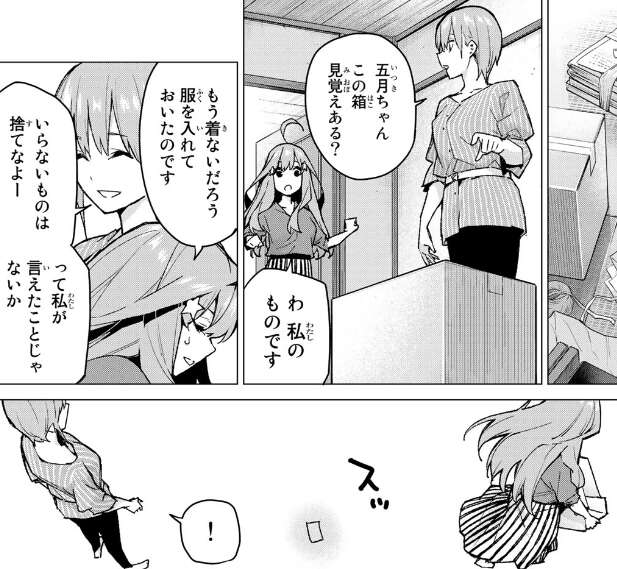 場面変わって、一花は部屋の大掃除中に見つかった段ボールに見覚えがあるか五月に聞き、五月は自分のものだと片付けようとしますが、何か写真を落とし一花はそれを拾います。