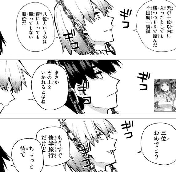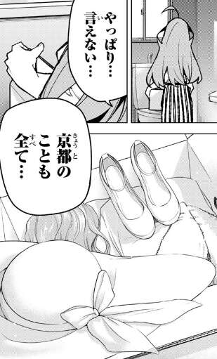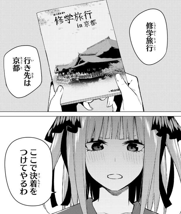最後に二乃、修学旅行の行き先は京都、その修学旅行のしおりを見ながらここで決着をつけると決意します。