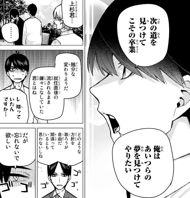 さらに風太郎はただ卒業までの勉強を見るだけでなく、五つ子たちの卒業後の次の道を見つけてやりたいと言います。風太郎の就任直後からの変わりように驚く中の父親ですが、娘たちには紳士的に接するように風太郎に釘を刺します。