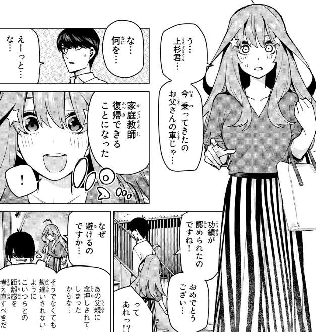 再び家庭教師に就任し、五つ子たちのアパートに来るまで送ってもらった風太郎は、そこで五月に会い功績が認められて再び家庭教師になったことを伝えます。五月に素直に喜んでもらえますが、紳士的に接すると言ってすぐなので、五月をつい避けてしまいます。