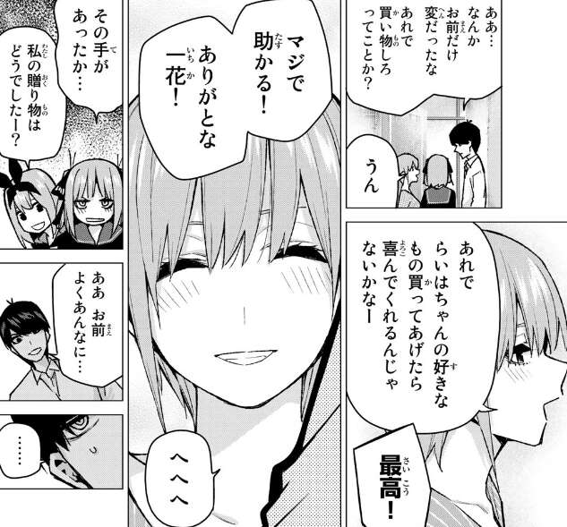 アパートの中に入ると一花たちは大掃除をしている最中ですが、風太郎を見つけて誕生日プレゼントの感想を聞いてきます。一花はギフトカードでらいはの好きなものを買ってあげて欲しいと言い、今度は一花たちと話が盛り上がりそうになってしまい距離をおくため、風太郎はもう帰宅すると言い帰ってしまいます。怪しい風太郎に玄関で隠し事がないか問い詰めます。