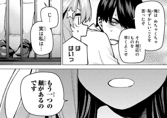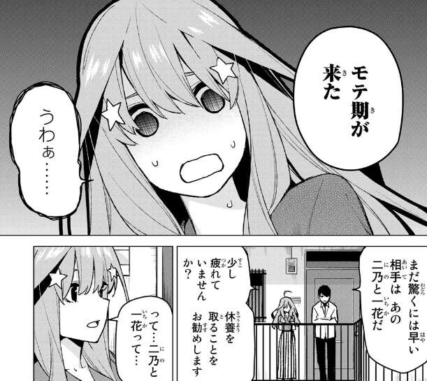 そこで五月は風太郎が隠している事を言えば、自分の隠し事も正直に話すと説得し、風太郎もいい機会だとモテ期が来たことを伝えます。驚くというより引く五月ですが、さらに相手は二乃と一花で、三玖と四葉は応援すると言っていると風太郎は言います。応援すると言った三玖が一花だったことにまだ気づいていない風太郎。