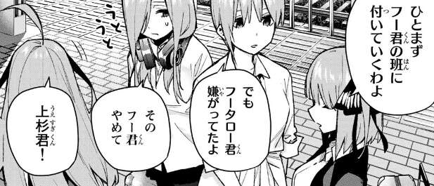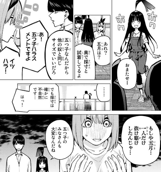 らいはが一人で帰ってきて五月がいませんが、五月は奥で採寸と試着をしているといいます。五つ子は全員、同じサイズだろうと風太郎は言いますが、それは五つ子ハラスメント!イツハラ!だと四葉は言った後、何故か今度は落ち込んでしまいます。同情するらいはです。
