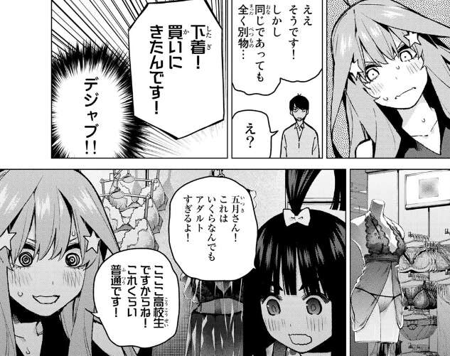 怒られた風太郎は四葉、五月を見つけて直接、誕生日プレゼントを聞こうとしますが、らいはに止められて聞けません。しかたなく風太郎は五月の買い物を観察して欲しいものを調べようとしますが、デジャブのごとく(23話、参照)五月は下着を買いに来ていて怒られてしまいます。