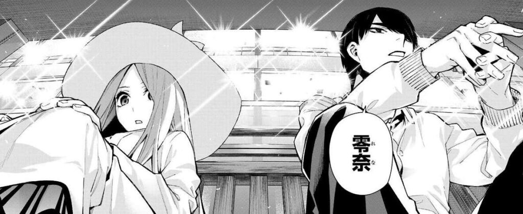 風太郎はらいは達を待っていると零奈が再び隣に現れますが、二回目は驚かねぇぞと冷静に対応します。残念がる零奈ですがすぐに修学旅行の京都、懐かしいねと昔の話へと話題を変えます。しかし林間学校後、試験対策の時に池でボートに乗ったとき(42話、参照)には、もう会えないと言っていたのに何故現れたと風太郎は聞きます。