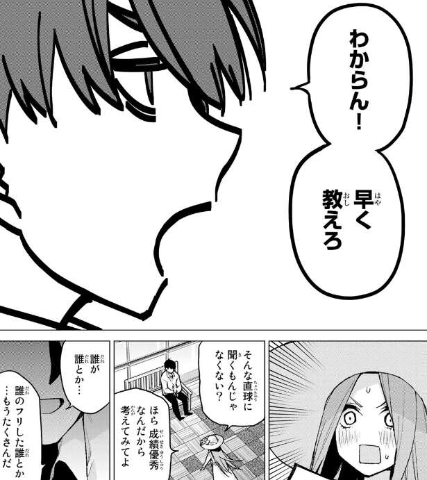 四葉は気を取り直して後悔のない修学旅行にしようと言いますが、風太郎とらいはの会話で写真の子にも会えるかもしれないしねと内容を聞き気になり始めます。四葉は写真の子って何ですかと聞きますが風太郎が回答を濁すと、四葉は途端に風太郎を問い詰めます。