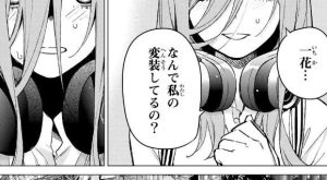 前回、三玖に変装した一花が、三玖と四葉に鉢合わせしてしまい、さらにそのタイミングで風太郎にも会ってしまいました。風太郎に自分が告白しようとしている事がバレてしまい、その場を走って去ってしまう三玖です。