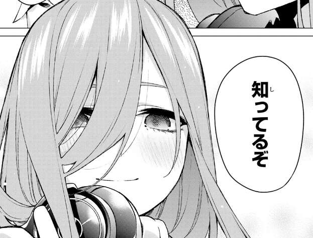 風太郎は三玖からの告白にも笑顔で知っているぞ、と答えます。風太郎から知っているぞ、と言われた三玖、とても嬉しそうです。
