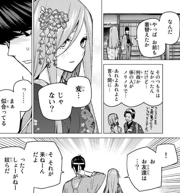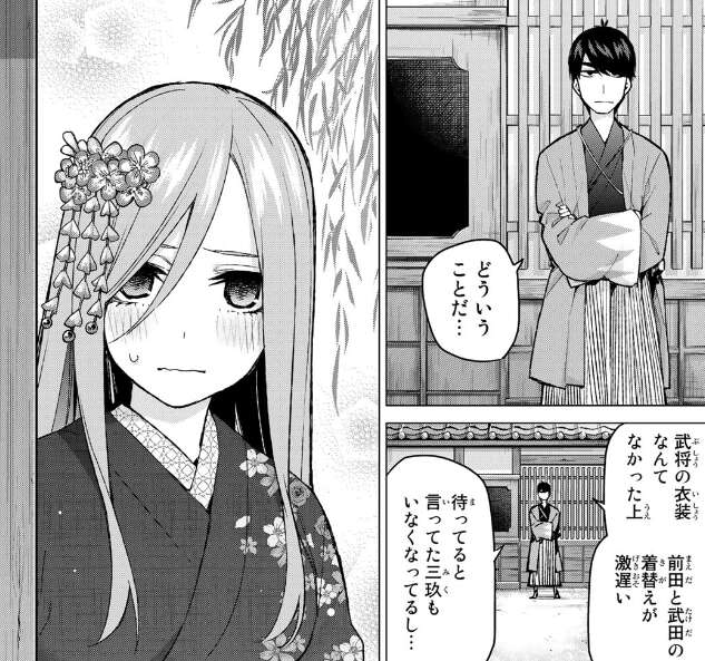 三玖から着物に着替えた自分が変じゃないかと聞かれ、風太郎は珍しく真面目に似合っていると答えます。急に恥ずかしくなったのか、前田と武田が来ないと話題を変えます。三玖から二人は既に着替えて先に出ていたと言われ、先に行ったかもと思った風太郎は二人に電話して連絡を取ろうとしますが、風太郎は二人の電話番号を知りませんでした。三玖から本当にお友達?と呆れられます。仕方なく二人を捜し始める三玖と風太郎です。