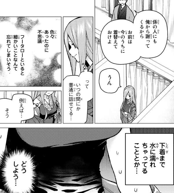 池に落ちたのは風太郎のせいだと文句を言いながらも、いつの間にか普通に話せている事に嬉しく思う三玖です。しかし濡れた着物を着替えようとしますが、下着が水に濡れてしまい替えの下着もなく三玖は困ってしまい、いっそタイツだけにしようかと悩みます。
