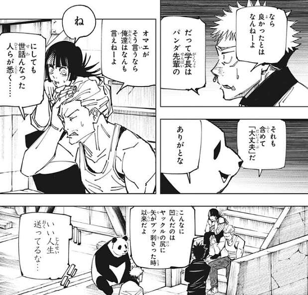 五条封印だけでなく夜蛾も死んでいたと分かり、にしても世話んなった人らが悉く……、とショックを隠せない秤は、こんなに凹んだのはヤックルの尻に矢がブッ刺さった時以来だよ、とつぶやきます。それを聞いた虎杖達は、いい人生送ってるな…、と心の中でつぶやきます。