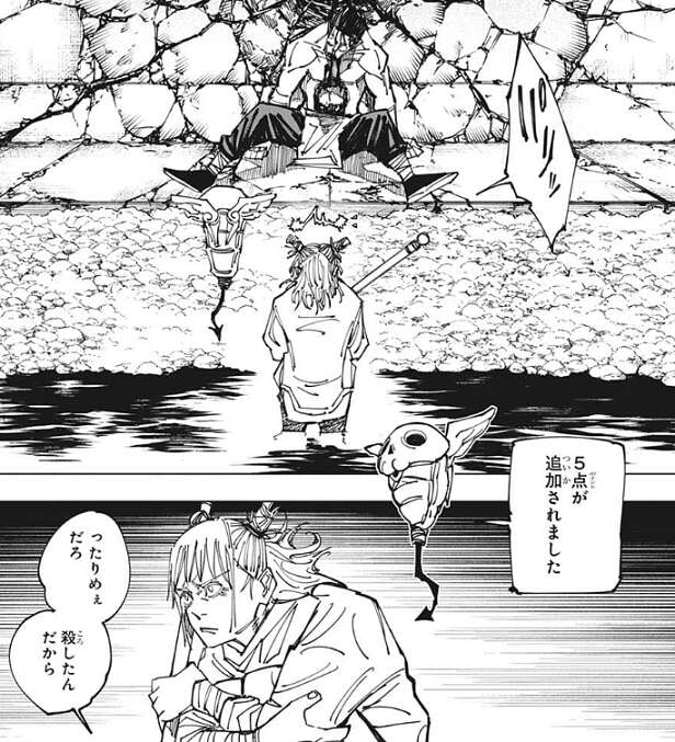 この総則9のルールを追加したのは鹿紫雲一で、場面はルールを追加する少し前に戻ります。鹿紫雲一は自分が殺した術師の死体を眺めていました。そして、5ポイントが追加され得点が200ポイントを超えると、100ポイントを消費して死滅回游にルールを追加します。この時に、総則9のルールを鹿紫雲一は追加していました。