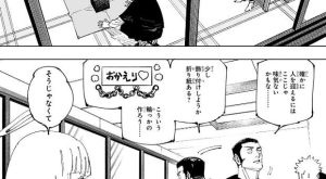 日時は11月1日 6時2分で、黒い結界は仙台結界(コロニー)のようです。佐々木と井口は仙台結界(コロニー)を眺めながら、羂索の話をします。どうやら井口をはじめ、他の人達の夢の中にも羂索は現れたようで、ロン毛の袈裟の男との話を皆しているようです。ただ井口は羂索から、息子と仲良くしてくれてありがとう、という類の話はされていないようです。その話を井口にしながら、佐々木は虎杖の事を思い出します。