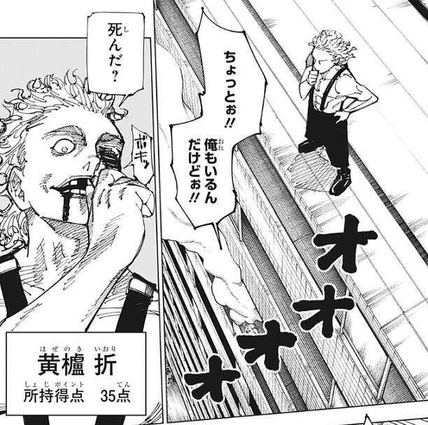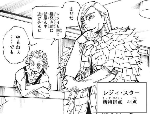 そこにレジィと黄櫨が地上に降りてきます。仲間の針千釣が殺されても動揺はなく、あーあ、ポイントがもったいな、とレジィがつぶやきますが、術式出す前に殺されてりゃ世話ないよ、と感想を言う程度で仲間の死を悲しむこともありません。伏黒は麗美がリタイヤしても2対1の状況で、さらに最初の爆撃のダメージが残っている不利な状況に領域展開を使うべきか考えます。しかし伏黒の領域展開は未完成のため、逃げられて出し損の最悪のパターンを考え領域展開を使うべきか、躊躇します。