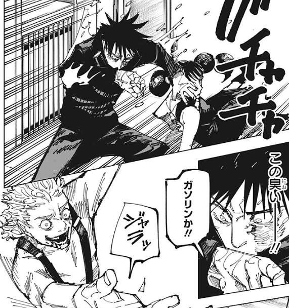 すると黄櫨が建物の上から降りてきてさらに攻撃しようとしますが、そこにレジィがレシートを伏黒に投げてきます。レシートはどうゆう原理か分かりませんが、ガソリンに変わり伏黒はガソリンを浴びてしまいます。そこに黄櫨が今度は自分の歯を使用して、再び爆発を起こします。