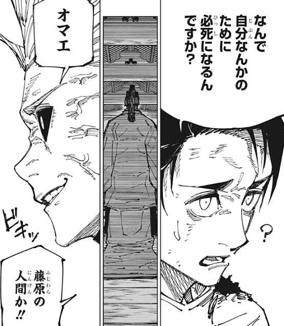 しかし乙骨は、友達とか恋人とかいないんですか?と、烏鷺に質問し、少し前まで自分も友達はいなかったけど、全く共感できない、と言い切ります。さらに、悔いがあるからって、何百年、何千年越しに人まで殺して……、なんで自分なんかのために必死になるんですか?と、乙骨は純粋に烏鷺に聞きます。乙骨の考え方が気に入らない烏鷺は、オマエ、藤原の人間か!!と、乙骨に言いますが、この時点で烏鷺はかなりブチギレています。