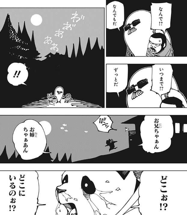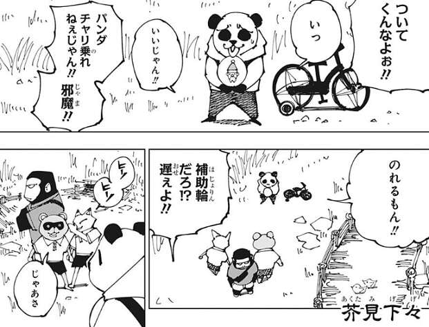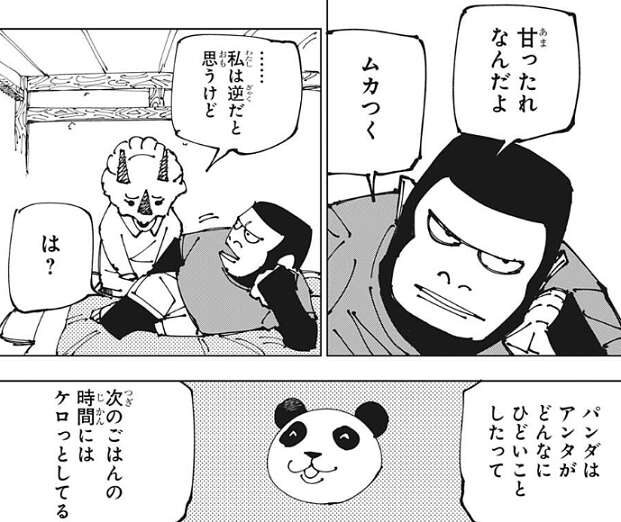 最初はパンダの心の中を表現したような世界で、デフォルメされたパンダがお兄ちゃんのゴリラにいじめられて、お姉ちゃんのトリケラトプスがそれを怒っています。しかし、話が進むとお兄ちゃん、お姉ちゃんはパンダに置いて行かれて、ずっとお別れになってしまうと、夜蛾正道に似た父ちゃんにお兄ちゃんのゴリラは言われてしまいます。そして、パンダは2つの核を失ってしまい、パンダ自身は大量に出血しボロボロの状態です。