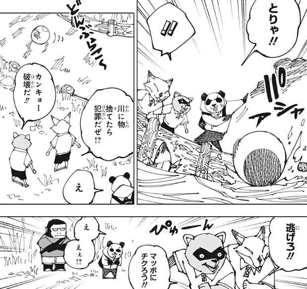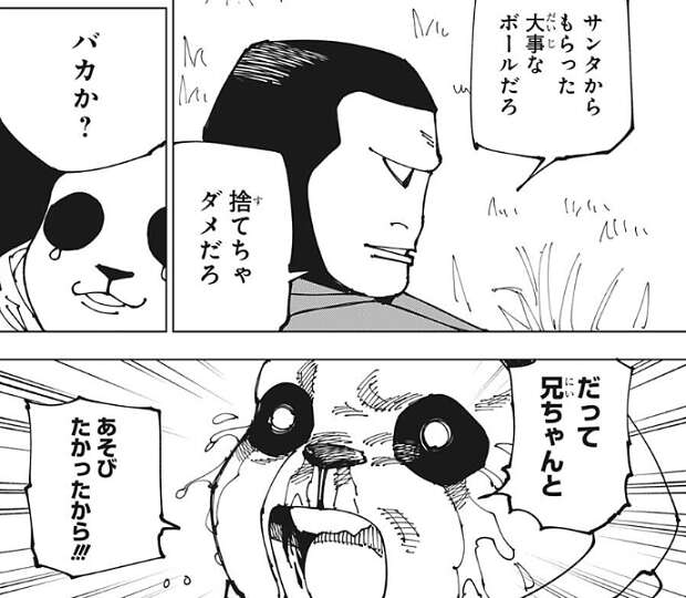タヌキとキツネが、パンダの持っているボールを捨てたら仲間に入れてやるよ、と煽りますが、パンダはこのボールはこども会でサンタさんがくれたものだからと嫌がります。それでもタヌキとキツネがボールを捨てるように煽ると、パンダはどこかをちらっと見た後にボールを捨てます。すると、タヌキとキツネが川に物捨てたら犯罪だぜ!?カンキョー破壊だ!!と、言い始め逃げ出します。泣きそうになっているパンダに、なんで捨てた、とお兄ちゃんのゴリラは話しかけます。