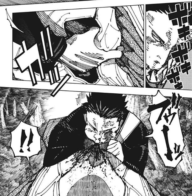 そんな分析をしていると、直哉は触手のような腕で加茂憲紀を攻撃してきて、加茂憲紀は攻撃をくらってしまい吹き飛ばされます。さらに直哉の体当たりもくらってしまい、加茂憲紀からは骨が複数、折れるような音が聞こえてきます。重傷を負う加茂憲紀ですが、直哉の頭の部分に自分の血を吹き付けます。