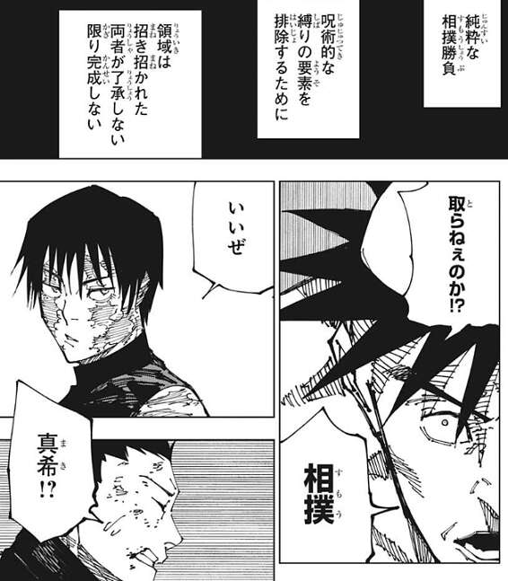 三代の領域は呪術的な縛りの要素を排除するために、領域は招かれた両者が了承しない限り完成しない仕様となっています。純粋な相撲勝負をするためで、この時点で真希が相撲勝負に応じていないため、まだ領域は完成していません。しかし、真希は三代の相撲勝負の誘いに応じて、相撲の土俵に上がったことで、三代の領域は完成します。いきなり相撲勝負に応じた真希に、加茂憲紀は驚き、何を考えている!!と、真希に叫びます。