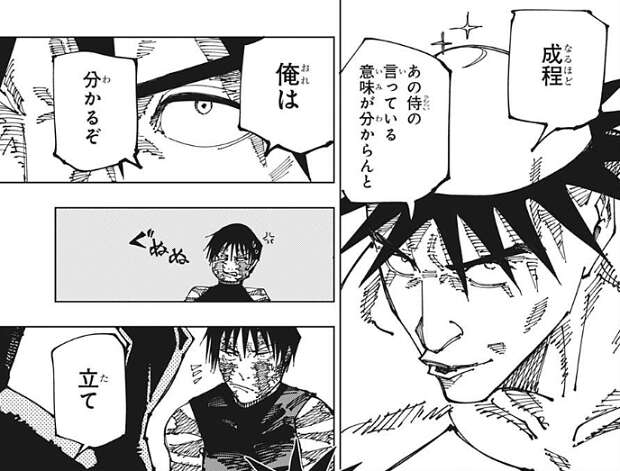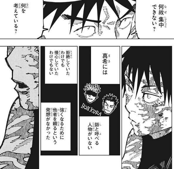 真希には師と呼べる人物がおらず(真希にとって五条や日下部はぼんくら扱いのようです)、強くなるために他社を頼るという発想がありませんでした。真希は三代に侍が言っている意味が分からない、と自分が考えている事を打ち明けます。