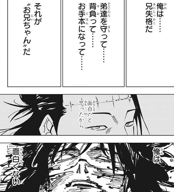動けないほどのダメージを負い、脹相は自分を兄失格だ、と心の中でつぶやきます。弟達を守って……、背負って……、お手本になって……、それが“お兄ちゃん”だ、と心の中でつぶやき、羂索に面白いと思ったから、と言われたことを思い出します。