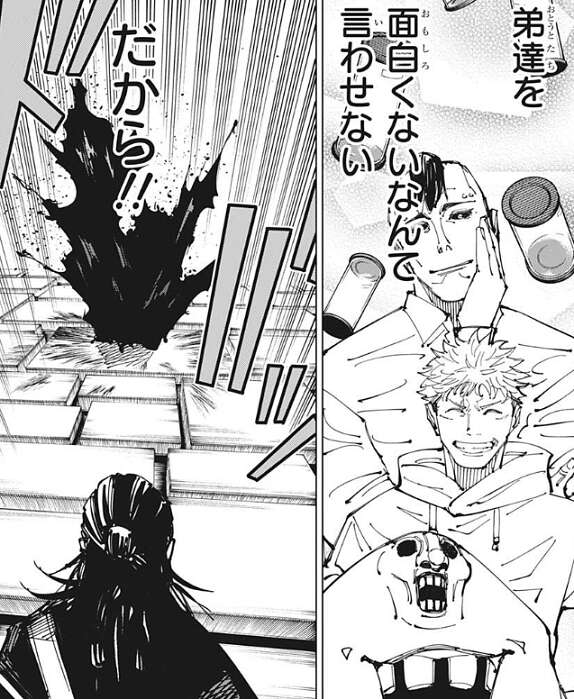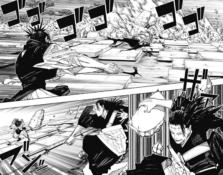 脹相は穿血で呪霊と一緒に、羂索がいた地点を薙ぎ払います。羂索は脹相の穿血をさらにかわしつつ、瓦礫を脹相に向けて投げます。脹相は瓦礫など投げられても無意味だと思い、ナメすぎだ、と羂索に言いますが、瓦礫はフェイクでさらに多数の呪霊を脹相に飛ばします。