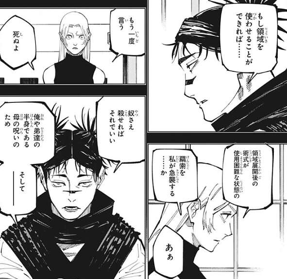 そして、羂索に領域展開を使わせることが出来れば、術式が使用困難な状態で九十九が羂索を急襲することが出来ます。もう一度言う、死ぬなよ、と九十九が言うと、脹相は、奴さえ殺せればそれでいい、と答えます。脹相は母親の呪いの為、そして虎杖の為に羂索を殺そうとします。