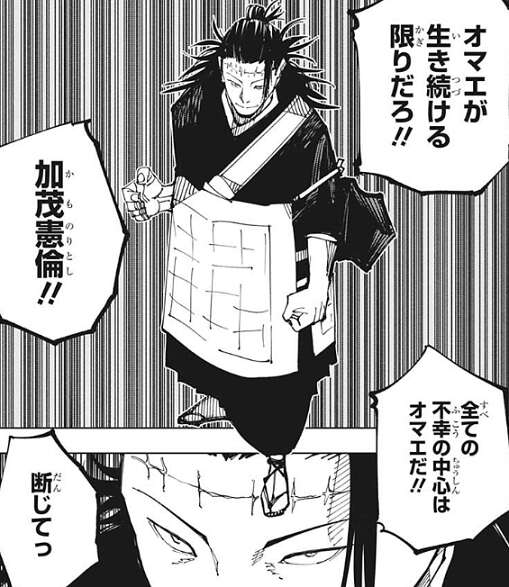 呪いの連鎖が止まらないのは、虎杖が生き続ける限りでなく、加茂憲倫が生き続ける限りだろ!!と、羂索が言うことを否定し、全ての不幸の中心はオマエだ!!と、脹相は断言します。しかし、その隙に羂索は脹相の足元に呪霊を這わせて脹相の足を縛り、脹相を身動きが出来ない状態にします。そして、身動きが取れない脹相を、至近距離から殴り、その後蹴り続けます。