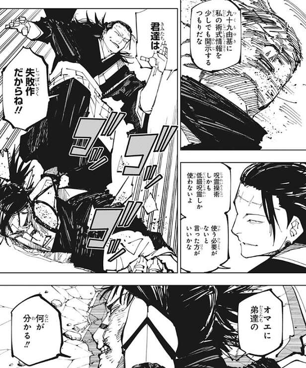羂索は脹相が術式情報を九十九に少しでも開示しようと考えている事を見抜いており、術式は呪霊操術の、低級呪霊しか使わない、と脹相に断言します。そして、使う必要がないとも言い、君達は失敗作だからね!!と、脹相と弟達を侮辱します。脹相は羂索の足を掴んで反撃しようとしますが、黒い呪霊の群れを羂索は脹相に放ちます。