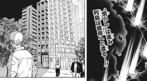 次に津美紀が結界(コロニー)内に転送され、伏黒と虎杖の前に現れた場面に写ります。伏黒と津美紀が会話している傍で、このまま事が進んで津美紀が死滅回游から離脱すれば、もう伏黒は大丈夫だと考えています。そして、天使に宿儺を自分ごと消してもらって、獄門疆“裏”から五条を開放してもらおう、と虎杖は考えます。やはり虎杖は、自分が死ぬことで五条を復活させようと考えているようです。