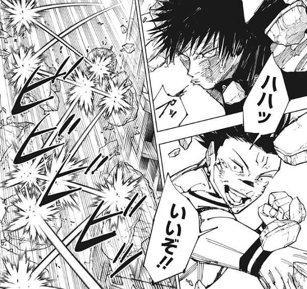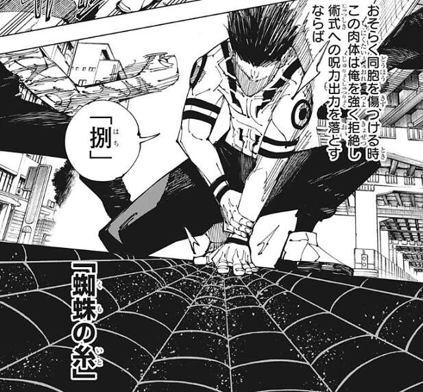 宿儺は二人の攻撃をさばきながら、伏黒にとっての仲間を傷つける時に伏黒の肉体は宿儺を強く拒絶して、術式への呪力出力を落とす、と考え、「捌」「蜘蛛の糸」という術を使います。この術は手をかざした場所に斬撃を加えるようで、真希や虎杖の足元の道路を砕きます。