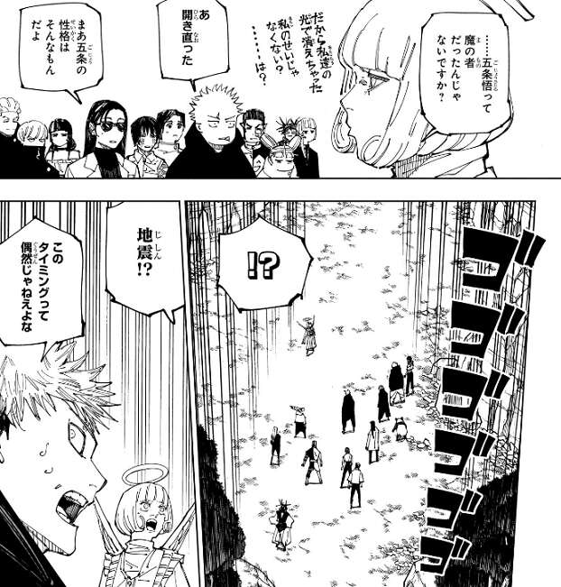 髙羽は、獄門疆裏に天使の術式をあてると…五条悟ごと消える、という新しいトリビアが生まれた、とつぶやきます。五条悟は魔の者だったから消えたのでは、と来栖は言い、自分のせいではないと開き直ります。そんなやり取りをしていると、突然地震が起こり、虎杖はこのタイミングは偶然出ないと直感します。