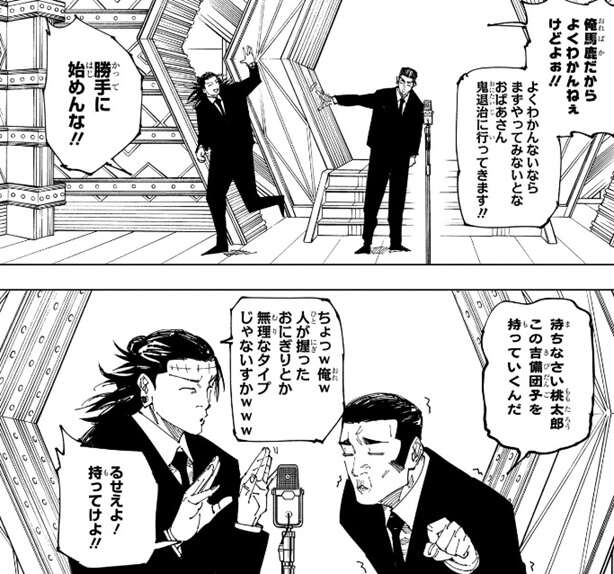 さらに、猿と記事だけ先に鬼ヶ島に行かせようとしたり、ウンコ爆弾最強ォー!!!と、羂索が叫んだり、と羂索は漫才でボケまくり、髙羽は羂索にツッコみまくっています。