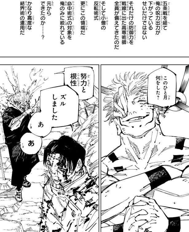 ここで高専術師全員が、宿儺の呪力出力が下がっているとはいえ、宿儺の攻撃に耐えられるだけの防御力を備えている事に宿儺は気付きます。さらに虎杖が反転術式を身につけている事、加えて乙骨の領域の必中術式の対象が宿儺のみに絞られている事にも違和感を覚えます。乙骨の領域の必中術式の対象が虎杖を除外していて、かなり高度な結界術の運用だ、と宿儺は心の中でつぶやき、宿儺はひと月でどうやって身につけたのか疑問に思います。このひと月何をした?と、宿儺は二人に聞きますが、虎杖は努力と根性と答えますが、乙骨はズルしました、と答えて、二人の答えがずれて微妙な雰囲気になります。